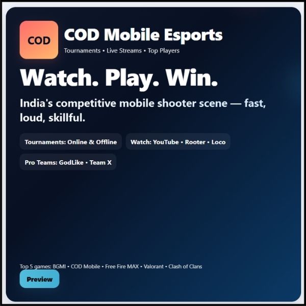 COD Mobile Esports ने भारतीय गेमिंग सीन को एक अलग ही पहचान दी है। अब बड़े-बड़े ब्रांड्स भी इस गेम के टूर्नामेंट्स को स्पॉन्सर करते हैं। यही वजह है कि हर महीने हजारों प्लेयर्स गूगल पर सर्च करते हैं कि “COD Mobile Esports / Tournaments कौन-कौन से हैं, लाइव स्ट्रीम कहाँ देख सकते हैं और प्रो प्लेयर्स कौन हैं?”