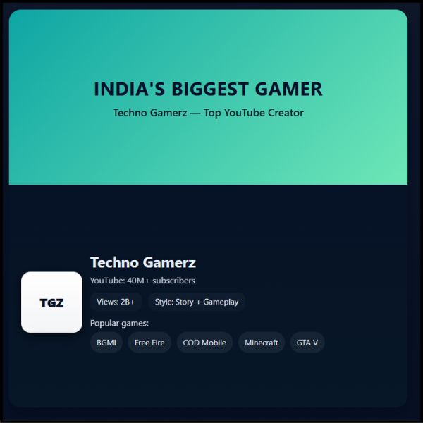 рддреЛ рдЕрдм рдЖрдкрдХреЛ рд╕рд╛рдл рд╣реЛ рдЧрдпрд╛ рд╣реЛрдЧрд╛ рдХрд┐ “India ka sabse bada Gamer YouTuber kaun hai?” тАУ рдЗрд╕рдХрд╛ рдЬрд╡рд╛рдм рд╣реИ Techno Gamerz (Ujjwal Chaurasia)ред рдЙрдиреНрд╣реЛрдВрдиреЗ рдЕрдкрдиреА рдореЗрд╣рдирдд, рд▓рдЧрди рдФрд░ рдЯреИрд▓реЗрдВрдЯ рд╕реЗ рдкреВрд░реЗ рднрд╛рд░рдд рд╣реА рдирд╣реАрдВ, рдмрд▓реНрдХрд┐ рджреБрдирд┐рдпрд╛ рдореЗрдВ рднреА рдЧреЗрдорд┐рдВрдЧ рдХреНрд░рд┐рдПрдЯрд░реНрд╕ рдХреА рджреБрдирд┐рдпрд╛ рдореЗрдВ рдЕрдкрдирд╛ рдирд╛рдо рдмрдирд╛рдпрд╛ рд╣реИред рдЕрдЧрд░ рдЖрдк рдЧреЗрдорд┐рдВрдЧ рдореЗрдВ рдХрд░рд┐рдпрд░ рдмрдирд╛рдирд╛ рдЪрд╛рд╣рддреЗ рд╣реИрдВ рддреЛ Techno Gamerz рдХреА рдЬрд░реНрдиреА рдЖрдкрдХреЗ рд▓рд┐рдП рдПрдХ рдмрдбрд╝реА рдЗрдВрд╕реНрдкрд┐рд░реЗрд╢рди рд╣реЛ рд╕рдХрддреА рд╣реИред рдФрд░ рдЕрдЧрд░ рдЖрдкрдХреЛ рдЬрд╛рдирдирд╛ рд╣реИ рдХрд┐ рднрд╛рд░рдд рдореЗрдВ рд╕рдмрд╕реЗ рдЬреНрдпрд╛рджрд╛ рдХреМрди рд╕реЗ рдЧреЗрдо рдкреЙрдкреБрд▓рд░ рд╣реИрдВ, рддреЛ рд╡реЛ рд╣реИрдВ BGMI, Free Fire, COD Mobile, Minecraft рдФрд░ GTA Vред