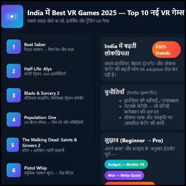 दोस्तों आपको बता दें कि 2025 में, Best VR Games India 2025 की मांग में चार-चाँद लग गए हैं, क्योंकि गेमर्स सिर्फ एंटरटेनमेंट नहीं बल्कि इमर्सिव एक्सपीरियंस चाहते हैं। अगर आप भी सोच रहे हैं कि कौन-से नई VR गेम्स अभी भारत में सबसे ज़्यादा ट्रेंड कर रहे हैं, तो यह आर्टिकल आपके लिए है।