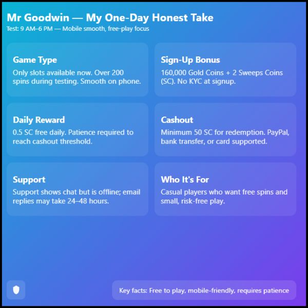 Mr Goodwin Sweepstakes Casino Review USA: My full-day honest take, straight from my phone